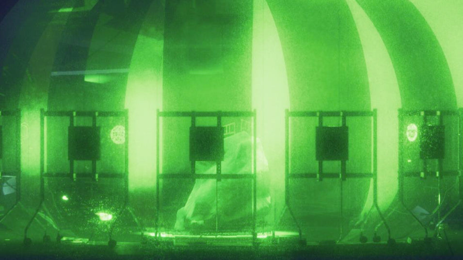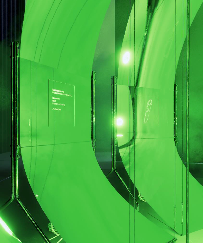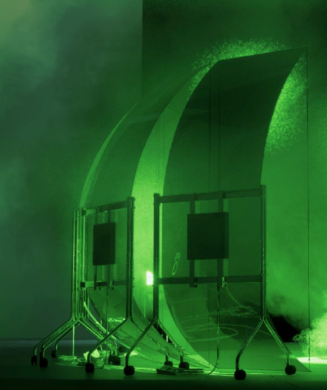 The installation is centered around Moon Rollin’ — Pedestal’s mobile TV stand — and explores how mobility can reshape the relationship between technology and space in the home. Inspired by lunar landing gear, the sculptural setup features curved mirror panels, green haze, and a central crater-like structure. Together, these elements create a weightless environment where the screen is no longer a fixed focal point, but a flexible object in motion.