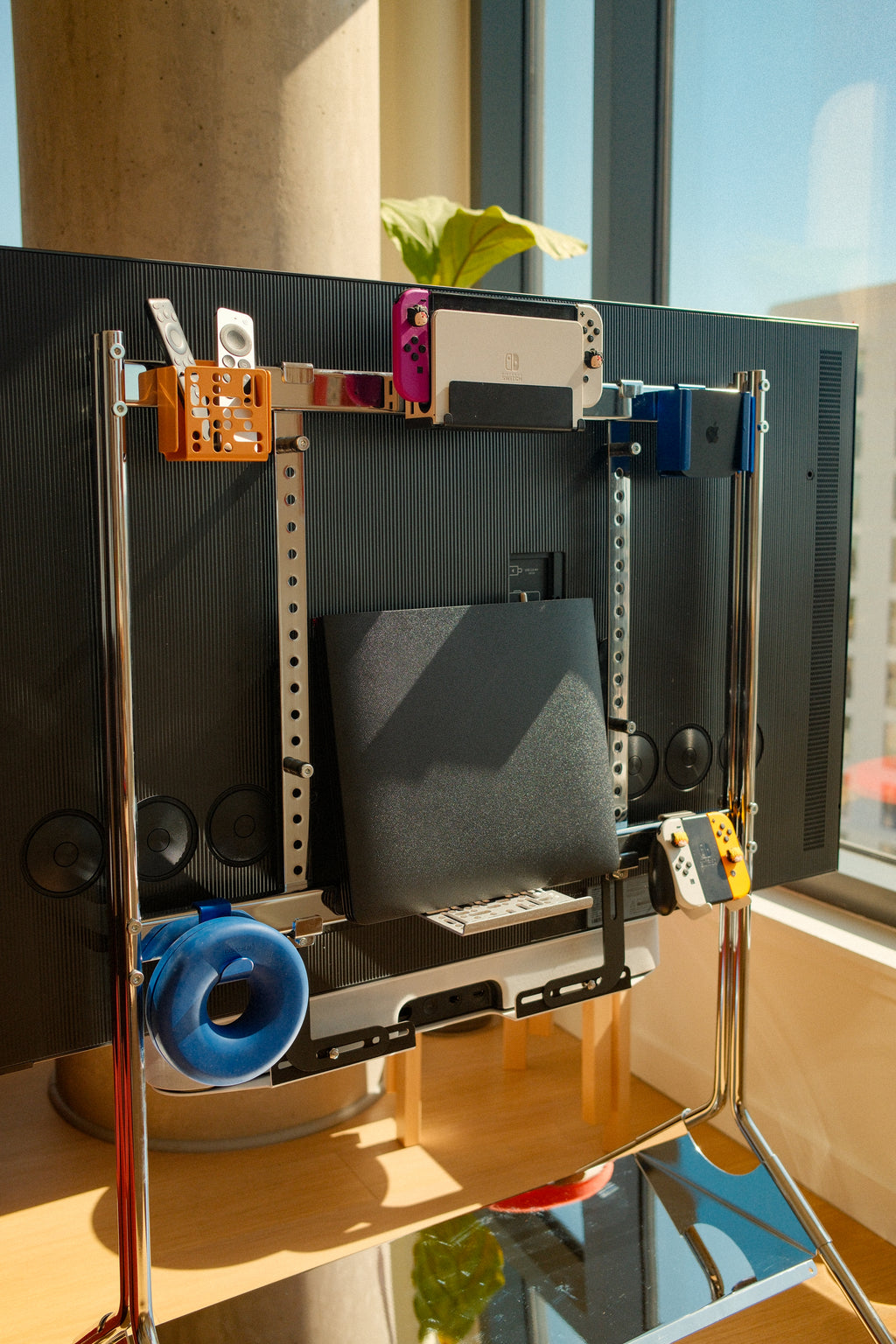 Deze kan op de standaard worden geplaatst — volledig onafhankelijk van de VESA-gaten — en is geschikt voor vrijwel elke soundbar.